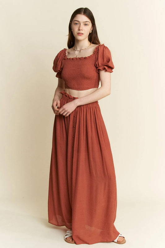Zenana Woven Crinkle Smocked Waist Maxi Skirt W Pockets
