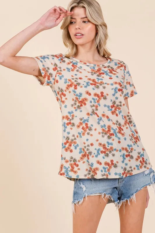 BOMBOM Lightweight Floral Round Neck Short Sleeve T-Shirt