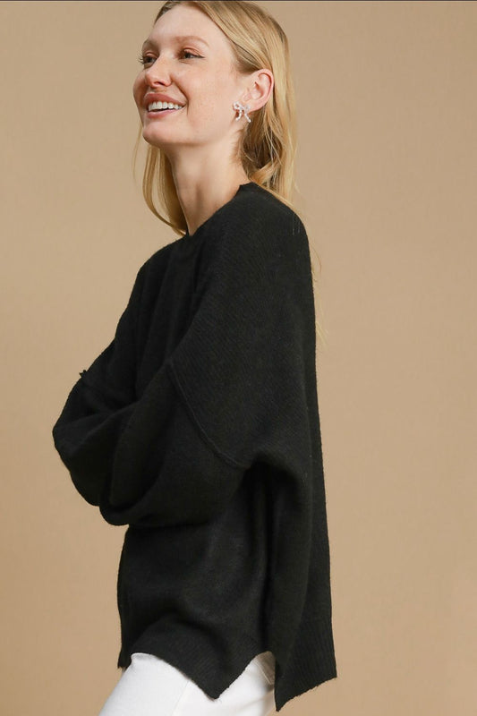 Umgee Full Size Side Slit Wool Blend Round Neck Sweater Plus Size