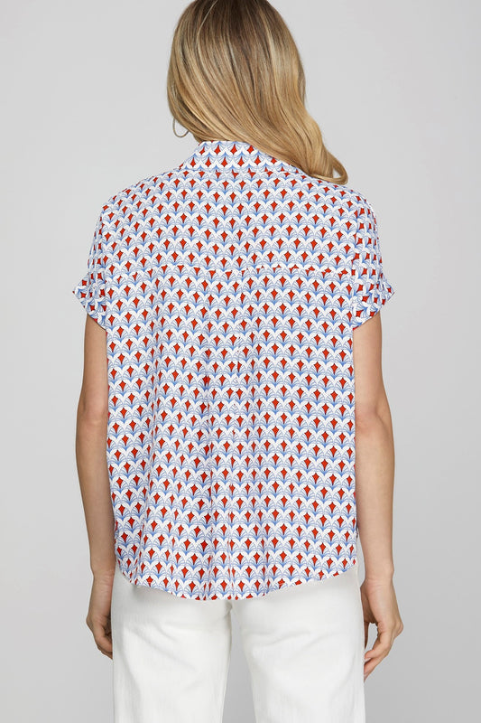 She + Sky Full Size Printed Johnny Collar Short Sleeve Blouse Plus Size