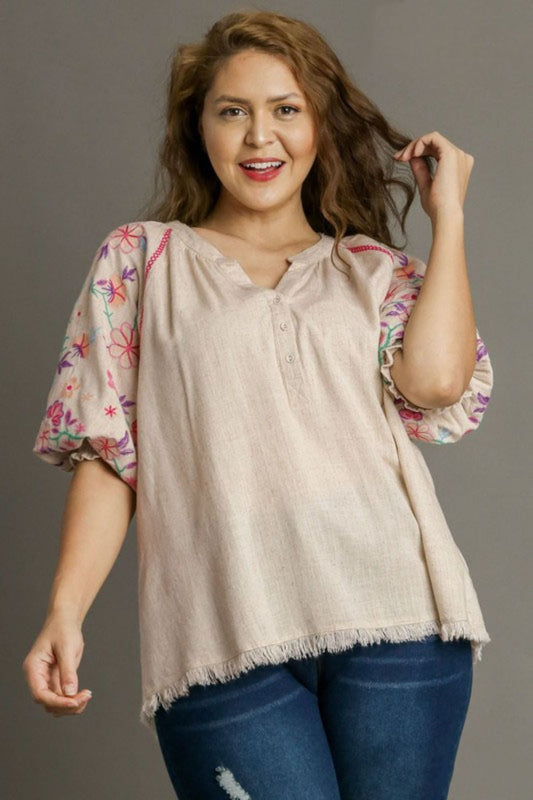 Umgee Full Size Half Button Top with Embroidery Sleeves Plus Size