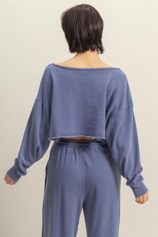 HYFVE Frayed Detail Boat Neck Long Sleeve Crop Top