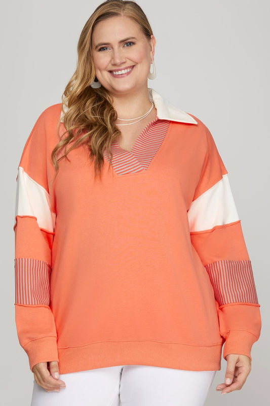 She + Sky Full Size Color Block Sleeve Johnny Collar French Terry Sweatshirt Plus Size