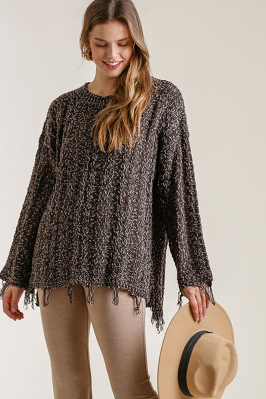 Umgee Full Size Frayed Hem Cable Knit Round Neck Sweater Plus Size