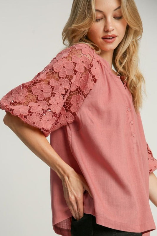 Umgee Full Size Lace Puff Sleeve Top Plus Size