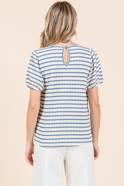 Annie Wear Striped Round Neck Puff Sleeve French Terry Top