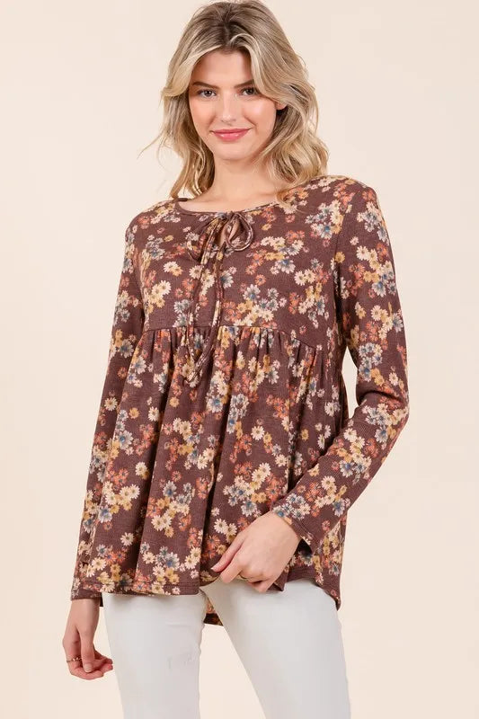 BOMBOM Floral Print Tie Neck Long Sleeve Blouse