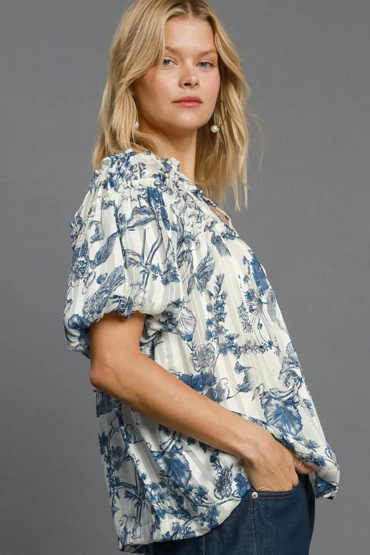 Umgee Full Size Floral Print Metallic Ruffle Blouse Plus Size