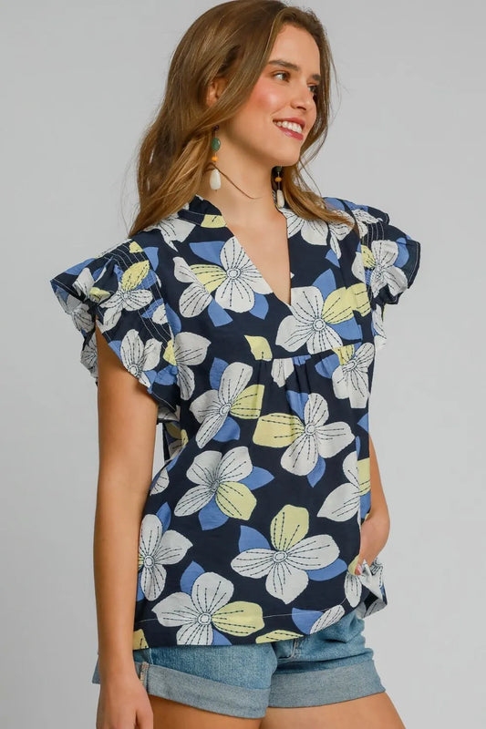 Umgee Full Size Floral Print Ruffled Cap Sleeve Babydoll Blouse Plus Size