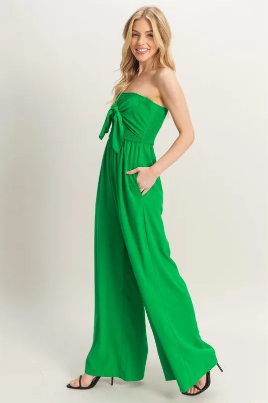 HYFVE Strapless Tie Front Smocked Jumpsuit