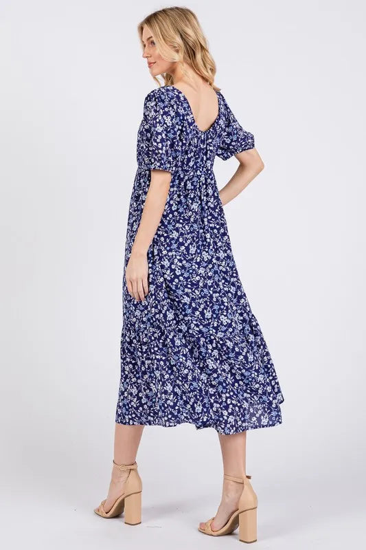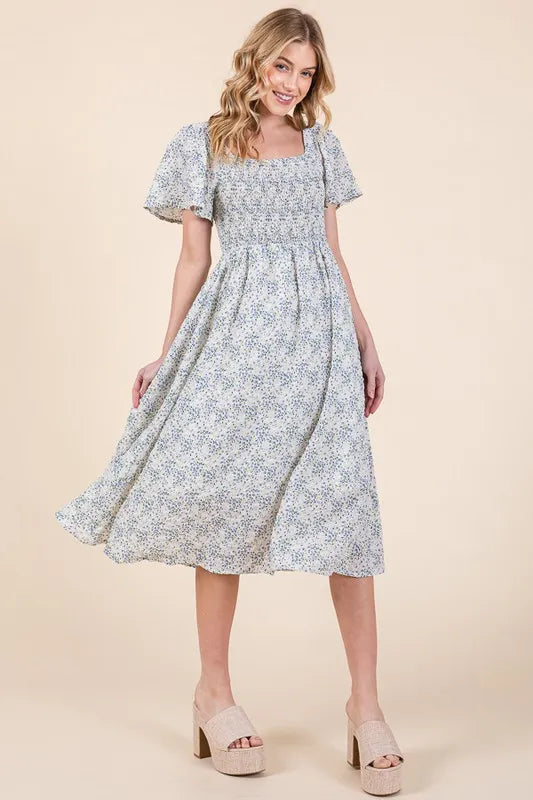 Ces Femme Floral Square Neck Puff Sleeve Midi Dress