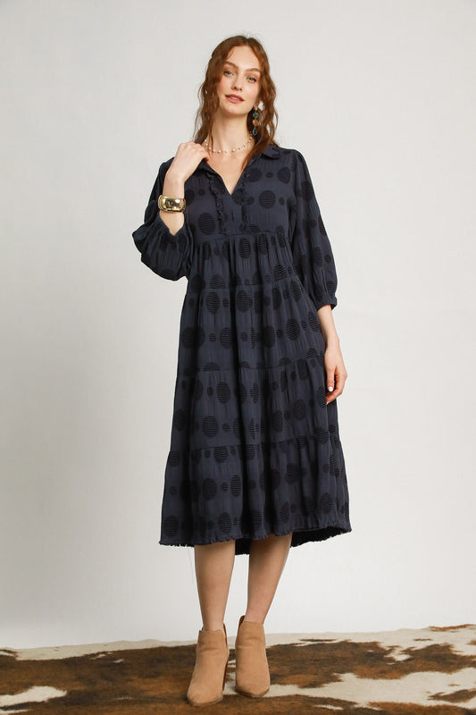 Umgee Full Size Swiss Dot Jacquard Tiered Midi Dress Plus Size