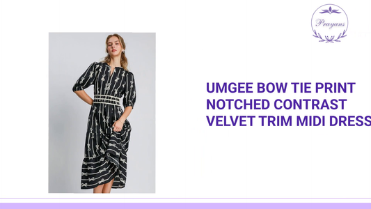 Umgee Bow Tie Print Notched Contrast Velvet Trim Midi Dress