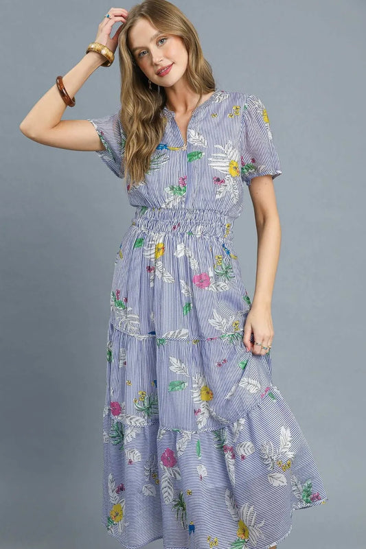 Umgee Smocked Waist Floral Short Sleeve Midi Dress