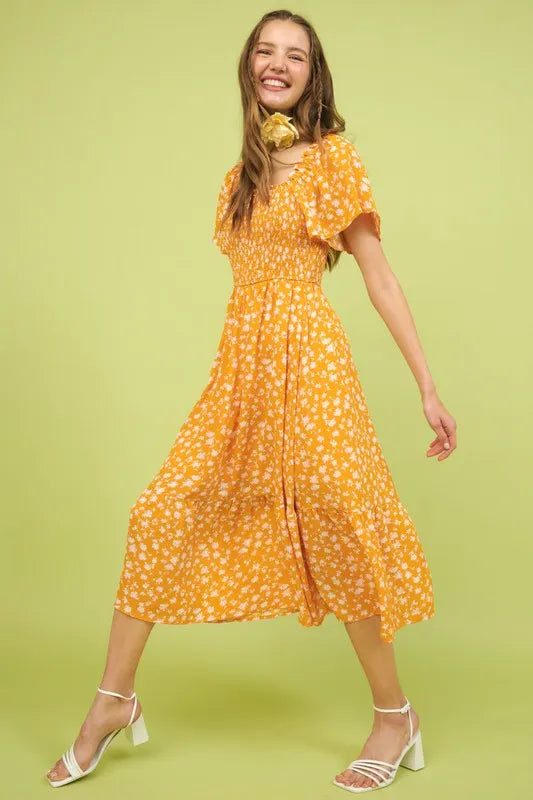 Mittoshop Flower Print Flutter Sleeve Smocked Midi Dress