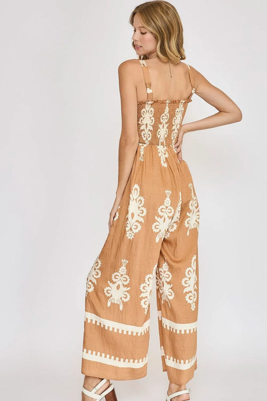 Umgee Full Size Smocked Printed Wide Leg Jumpsuit Plus Size